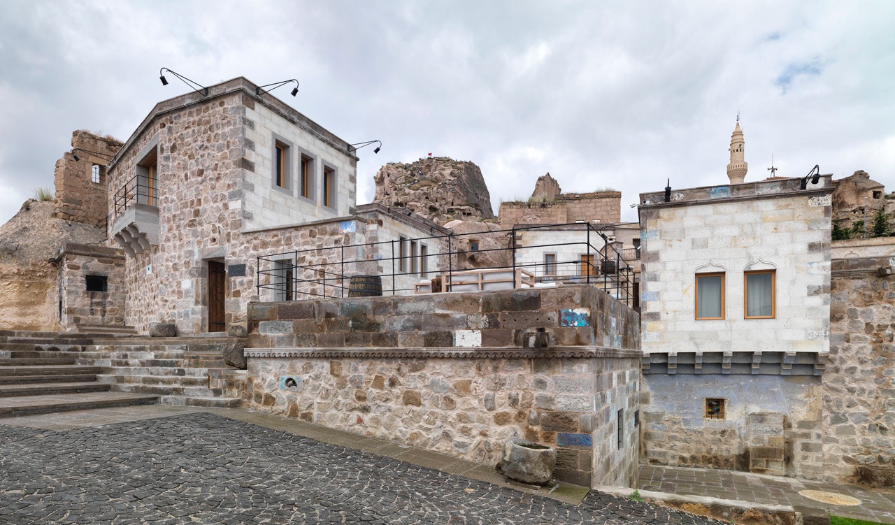 Located in a partially abandoned area of historic Uçhisar town, the project site includes small old houses and spaces carved in rock, all damaged. The existing stone structures and carved spaces will be restored; new ones will be added, all organized around a central courtyard space.